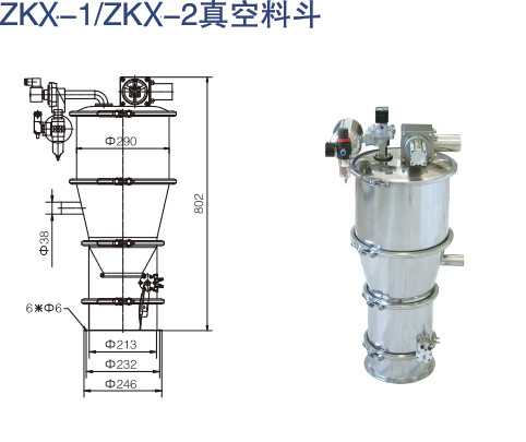 ZKX真空上料机是一种粉状料、 粒状料、粉粒混合料的真空输送设备。能自动地将各种物料输送到包装机、 注塑机、 粉碎机等设备的料斗中, 也能直接把被混合的物料输送到混合机(如V型混合机、 二维混合机、三维混合机等)中, 减轻了工人的劳动强度, 解决了加料时粉尘外溢等问题, 是制药厂, 食品厂通过 "GMP"认证, 促进清洁、 文明生产的设备。